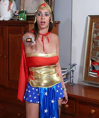 This next one is a bit different as it shows Jen, our sexy Wonder-woman, go from being a righteous crime fighter who tries to arrest me, to being a completely oversexed and somewhat stupid little bimbo who wants nothing more than to get fucked by me and everybody else in the universe. Really amazing segment. Needless to say that I warned her about using the "stun- " on me due to the fact that I had previously tinkered with it but of course she does not believe me. After a couple of "mindlessly dim moments" Jen has no other intentions than to slap me with her tits, get fucked by me, masturbate and what have you.